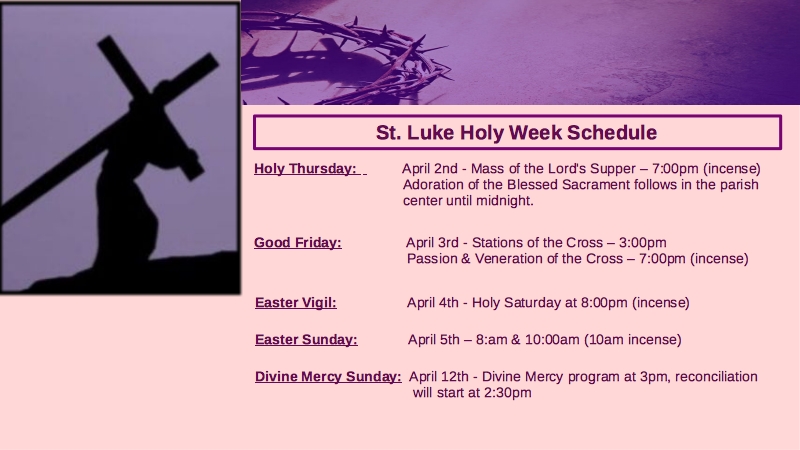 Click Here To Go To Our FaceBook Page ForVideos and Updates From Father Backer Click here To Go To Our FaceBook Page For Videos and Updates From Father Backer Get the free Amen app Click the image above more more info. Click the image above for more information about Formed Formed - The premier Catholic streaming service that brings beautiful and faithful Catholic content to parishes, families, and individuals. Click the image above to learn more about the Great Adventure The Great Adventure - Your Journey Through The Bible Click Here For The Faith Formation Calendar Of Classes & Events Adoration Chapel Church of St. LukePrayer Line Donate Online United States Conference ofCatholic Bishops